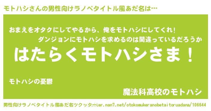 | ヒーロー風カッコイイあだ名 | 『正義の使者モトハシ』『魔戒騎士モト』 |