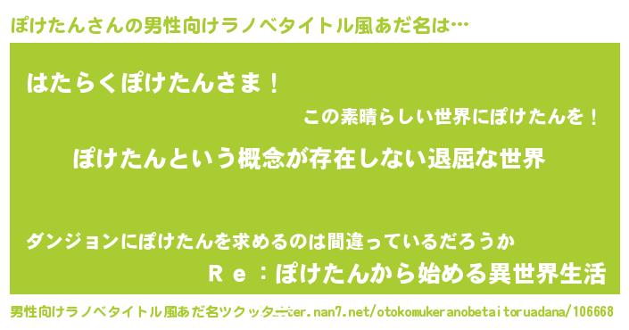 | 女子向けラノベタイトル風あだ名 | 『異世界で失敗しない100のぽけたん』 |