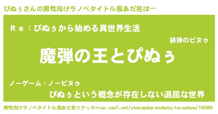 | 女子向けラノベタイトル風あだ名 | 『乙女ゲームの破滅フラグしかない悪役ぴぬぅに転生してしまった…』 |