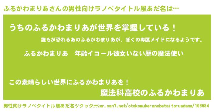 | 女子向けラノベタイトル風あだ名 | 『ふるかわまりあの玉の輿計画!』 |