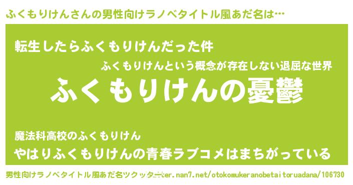| 女子向けラノベタイトル風あだ名 | 『ふくもりけん姫と円卓の騎士』 |