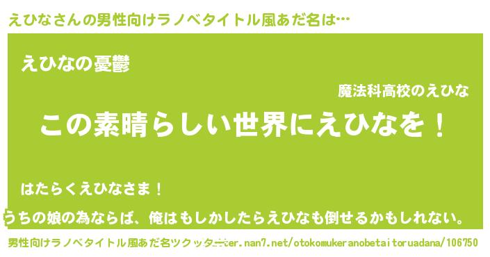 | 女子向けラノベタイトル風あだ名 | 『乙女ゲームの破滅フラグしかない悪役えひなに転生してしまった…』 |