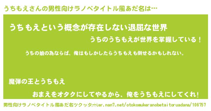 | 女子向けラノベタイトル風あだ名 | 『うちもえ伯爵の花嫁』『うちもえ恋絵巻』 |