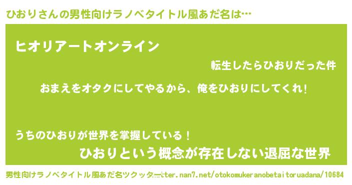 | 女子向けラノベタイトル風あだ名 | 『ひおり恋絵巻』『ひおり姫と円卓の騎士』 |
