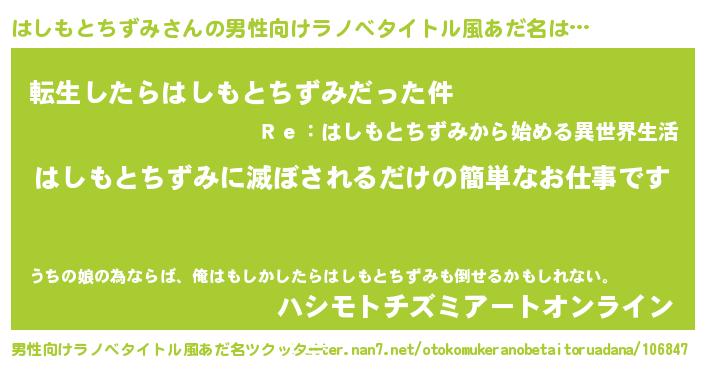 | 女子向けラノベタイトル風あだ名 | 『横柄はしもとちずみと宰相陛下』 |