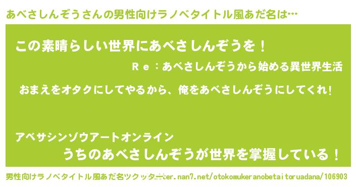 | 女子向けラノベタイトル風あだ名 | 『あべさしんぞう恋絵巻』 |