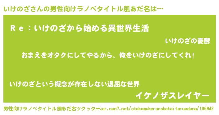 | 女子向けラノベタイトル風あだ名 | 『いけのざ夫妻のなれそめ』 |