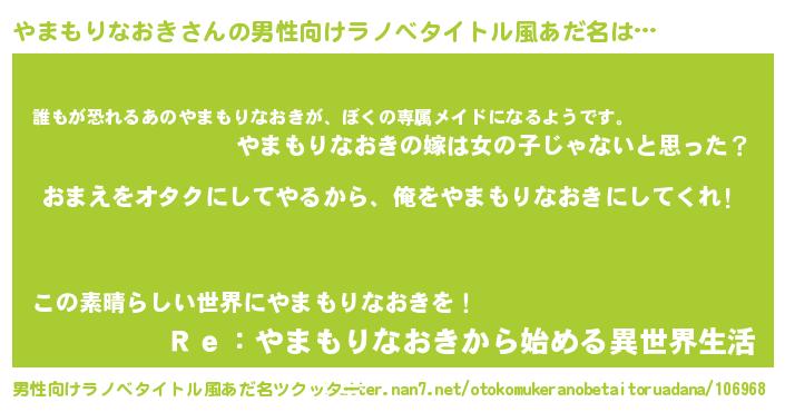 | 女子向けラノベタイトル風あだ名 | 『やまもりなおき夫妻のなれそめ』 |