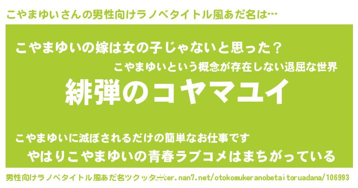 | 胡散臭い通販商品みたいなあだ名 | 『信頼と実績のサプリメント…その名も「こやまゆい」』 |
