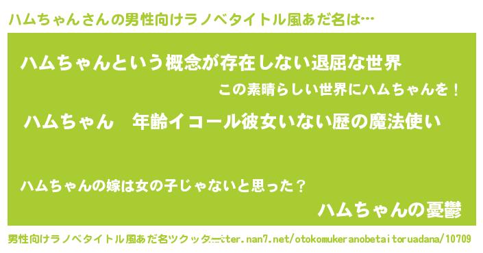 | 女子向けラノベタイトル風あだ名 | 『ハムちゃんの玉の輿計画!』 |