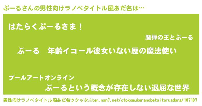 | 女子向けラノベタイトル風あだ名 | 『ぷーるの玉の輿計画!』 |