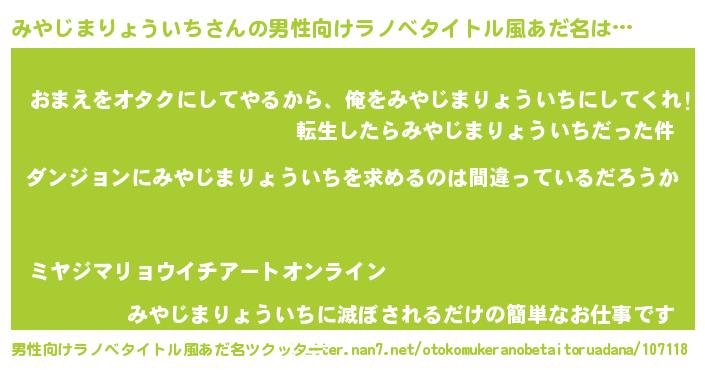 | 女子向けラノベタイトル風あだ名 | 『みやじまりょういちの卵を拾いまして』 |