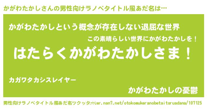 | 胡散臭い通販商品みたいなあだ名 | 『来世でも幸せになれる水素水…その名も「かがわたかし」』 |