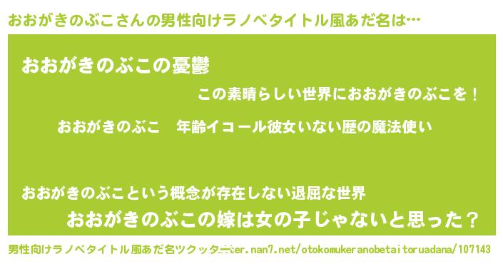 | 女子向けラノベタイトル風あだ名 | 『おおがきのぶこの玉の輿計画!』 |
