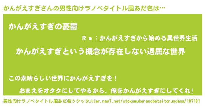 | 女子向けラノベタイトル風あだ名 | 『異世界で失敗しない100のかんがえすぎ』 |