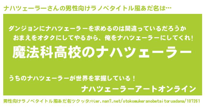 | 女子向けラノベタイトル風あだ名 | 『ナハツェーラーなんてお断りですっ。』 |