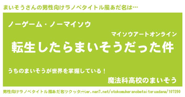 | 女子向けラノベタイトル風あだ名 | 『まいそうの玉の輿計画!』 |