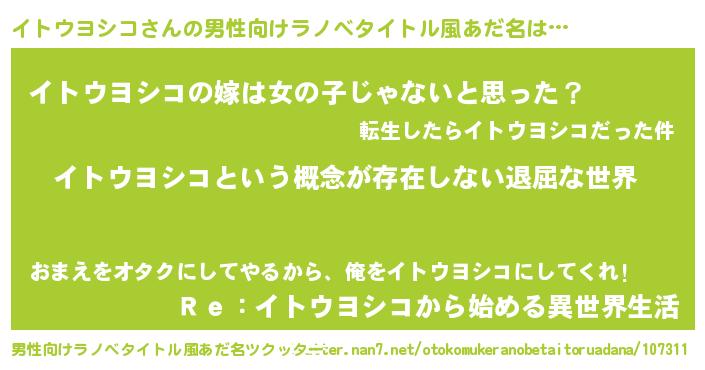 | 女子向けラノベタイトル風あだ名 | 『異世界で失敗しない100のイトウヨシコ』 |