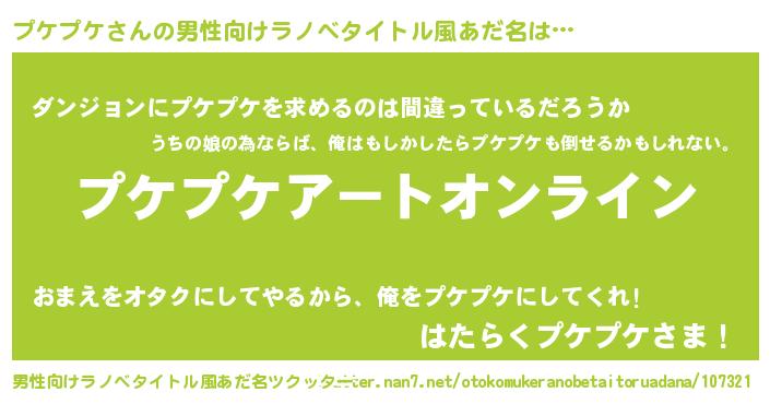 | 女子向けラノベタイトル風あだ名 | 『プケプケ姫と円卓の騎士』 |