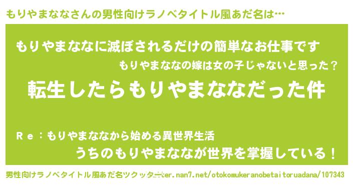 | 女子向けラノベタイトル風あだ名 | 『もりやまななの玉の輿計画!』 |