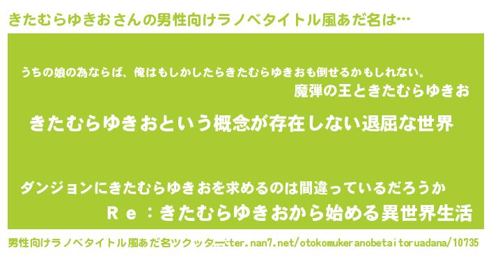 | 女子向けラノベタイトル風あだ名 | 『異世界で失敗しない100のきたむらゆきお』 |