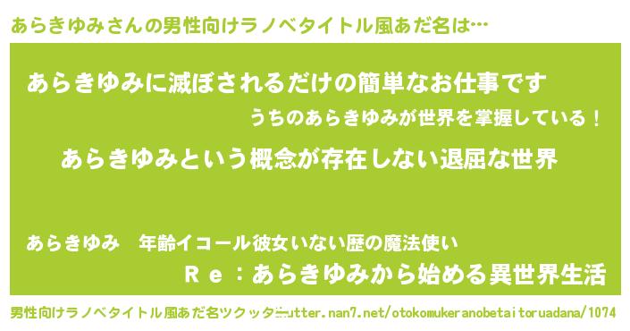 | 胡散臭い通販商品みたいなあだ名 | 『来世でも幸せになれる健康食品…その名も「あらきゆみ」』 |