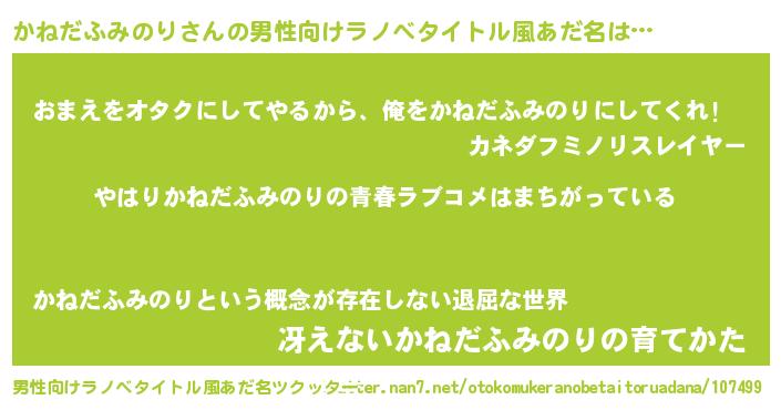 | 女子向けラノベタイトル風あだ名 | 『かねだふみのり伯爵の花嫁』 |
