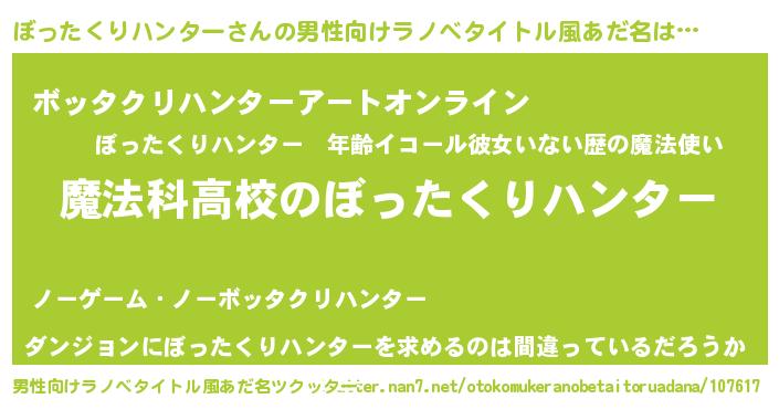 | 女子向けラノベタイトル風あだ名 | 『ぼったくりハンターなんてお断りですっ。』 |