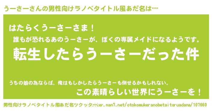 | ヒーロー風カッコイイあだ名 | 『仮面ウーダー』『ネオウーサー』 |