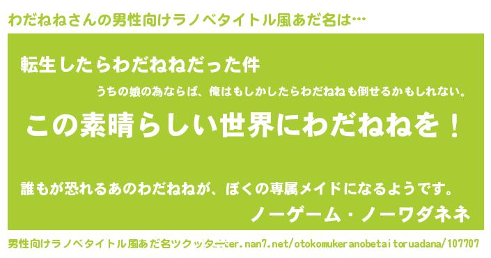 | 意味不明あだ名 | 『住所不定無職わだねね(65歳)』 |