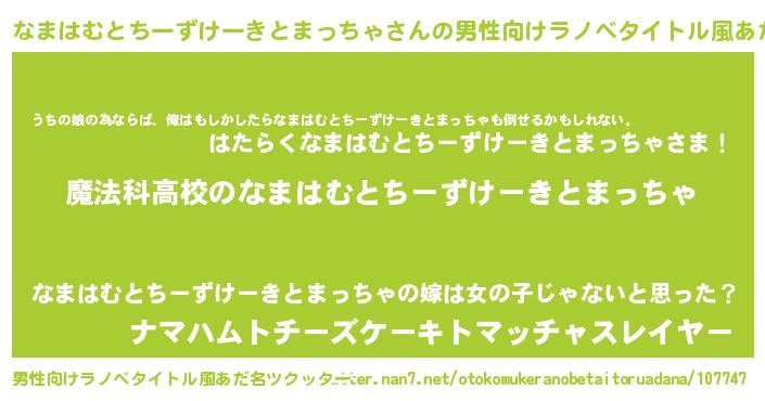 | 女子向けラノベタイトル風あだ名 | 『なまはむとちーずけーきとまっちゃアンティーク』 |