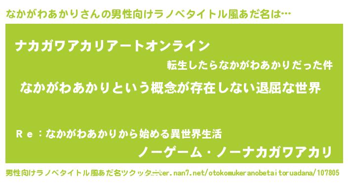 | 女子向けラノベタイトル風あだ名 | 『異世界で失敗しない100のなかがわあかり』 |
