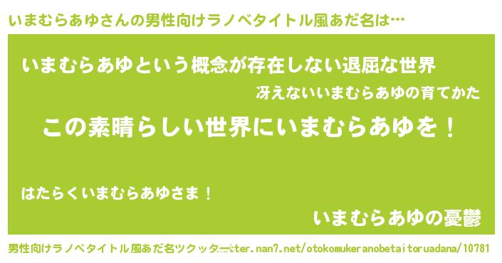 | 女子向けラノベタイトル風あだ名 | 『悪役いまむらあゆに転生したようですが、知った事ではありません』 |