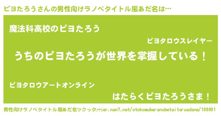 | 意味不明あだ名 | 『自称ピヨたろう』『ペロリンピヨたろう』 |
