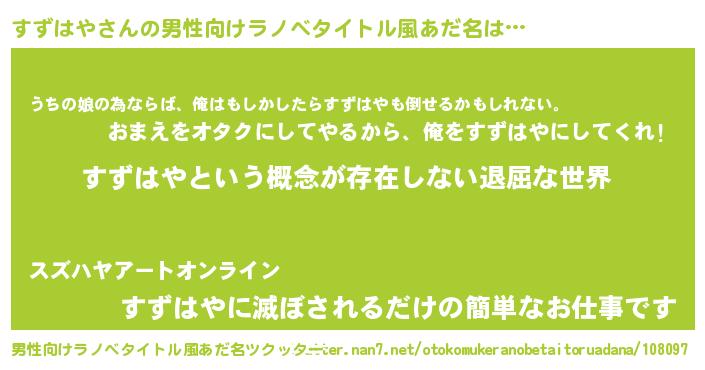 | 胡散臭い通販商品みたいなあだ名 | 『絶対に幸福をもたらす水素水…その名も「すずはや」』 |