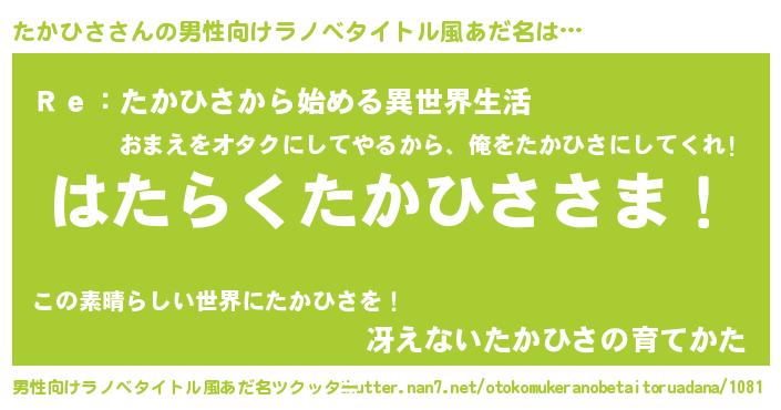 | ヒーロー風カッコイイあだ名 | 『ウルトラ戦士タカヒサ』『仮面タカダー』 |