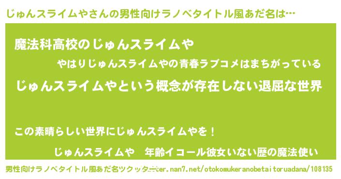 | 女子向けラノベタイトル風あだ名 | 『じゅんスライムやの契約王妃』 |