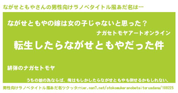 | 女子向けラノベタイトル風あだ名 | 『ながせともやの玉の輿計画!』 |