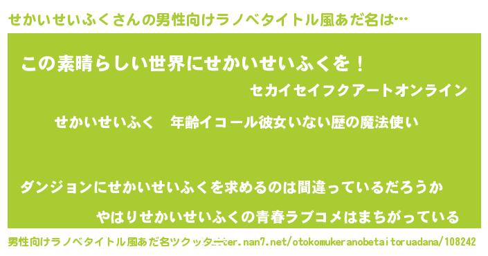 | 胡散臭い通販商品みたいなあだ名 | 『あなたにだけ特別に提供する100年もののヴィンテージワイン…その名も「せかいせいふく」』 |