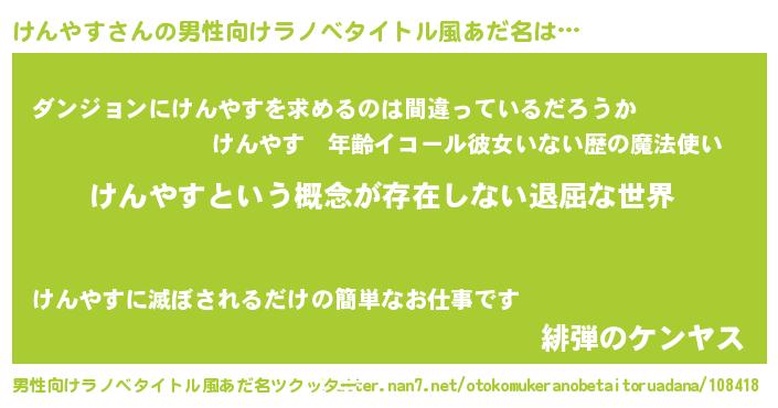 | 女子向けラノベタイトル風あだ名 | 『異世界で失敗しない100のけんやす』 |