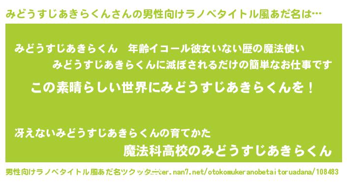 | 女子向けラノベタイトル風あだ名 | 『乙女ゲームの破滅フラグしかない悪役みどうすじあきらくんに転生してしまった…』 |