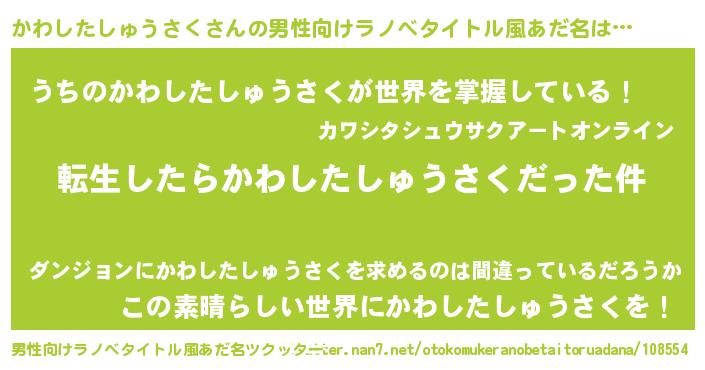 | 女子向けラノベタイトル風あだ名 | 『かわしたしゅうさくの玉の輿計画!』 |