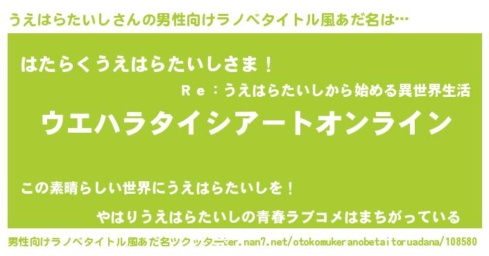 | 女子向けラノベタイトル風あだ名 | 『誰かこのうえはらたいしを説明してください! ~契約から始まるウェディング~』 |