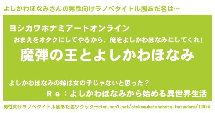 | 女子向けラノベタイトル風あだ名 | 『乙女ゲームの破滅フラグしかない悪役よしかわほなみに転生してしまった…』 |