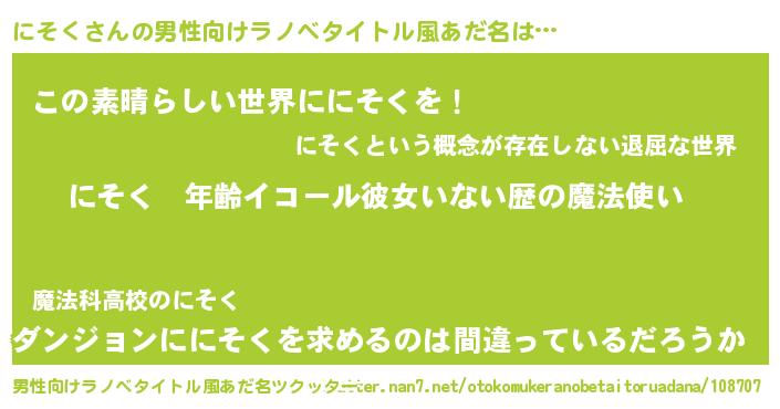 | 胡散臭い通販商品みたいなあだ名 | 『あなたにだけ特別に提供する100年もののヴィンテージワイン…その名も「にそく」』 |