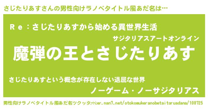 | 女子向けラノベタイトル風あだ名 | 『さじたりあすが死なない童話 林檎のさじたりあすの診療簿』 |