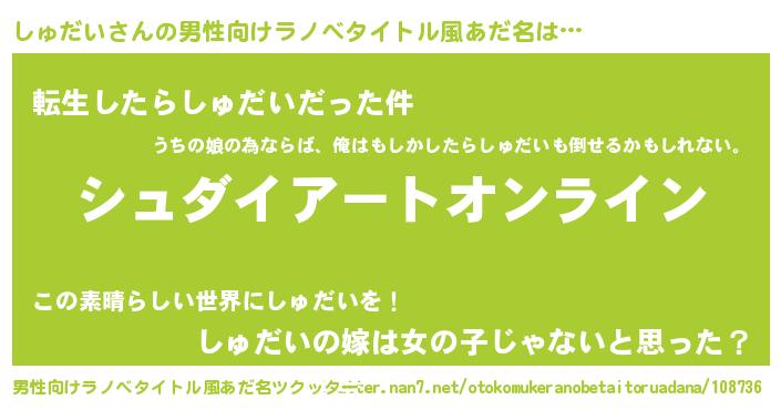 | ヒーロー風カッコイイあだ名 | 『スーパーシュダイ』『銀牙騎士シュ』 |