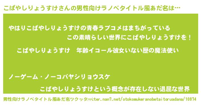 | 女子向けラノベタイトル風あだ名 | 『こばやしりょうすけの玉の輿計画!』 |