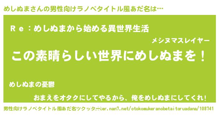 | 意味不明あだ名 | 『住所不定無職めしぬま(10歳)』 |