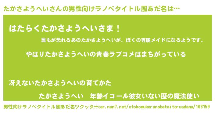 | 女子向けラノベタイトル風あだ名 | 『たかさようへい伯爵の花嫁』 |